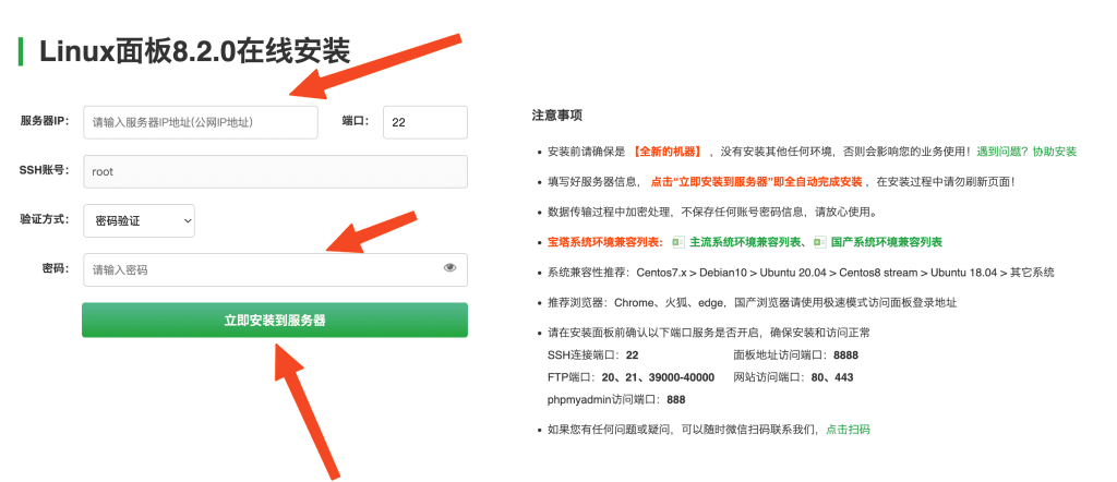 第一步,打开宝塔官网,向下滚动页面,找到Linux面板在线安装。在网页中填入服务器的IP和root密码,点击“立即安装到服务器”绿色按钮。