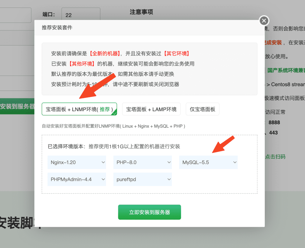 之后网站会检查填入的服务器密码,如果密码正确,会提示选择安装套件。这里选择推荐的“宝塔面板+LNMP环境”。