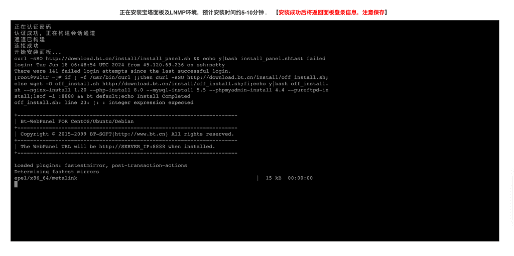 然后就正式开始宝塔面板的安装过程了,这时候只需要等待,不需要按任何按键,不需要输入任何命令。直到出现下面信息,说明安装已经完成。复制记录下登录信息,并保存好,就可以关闭这个黑色的终端程序了。