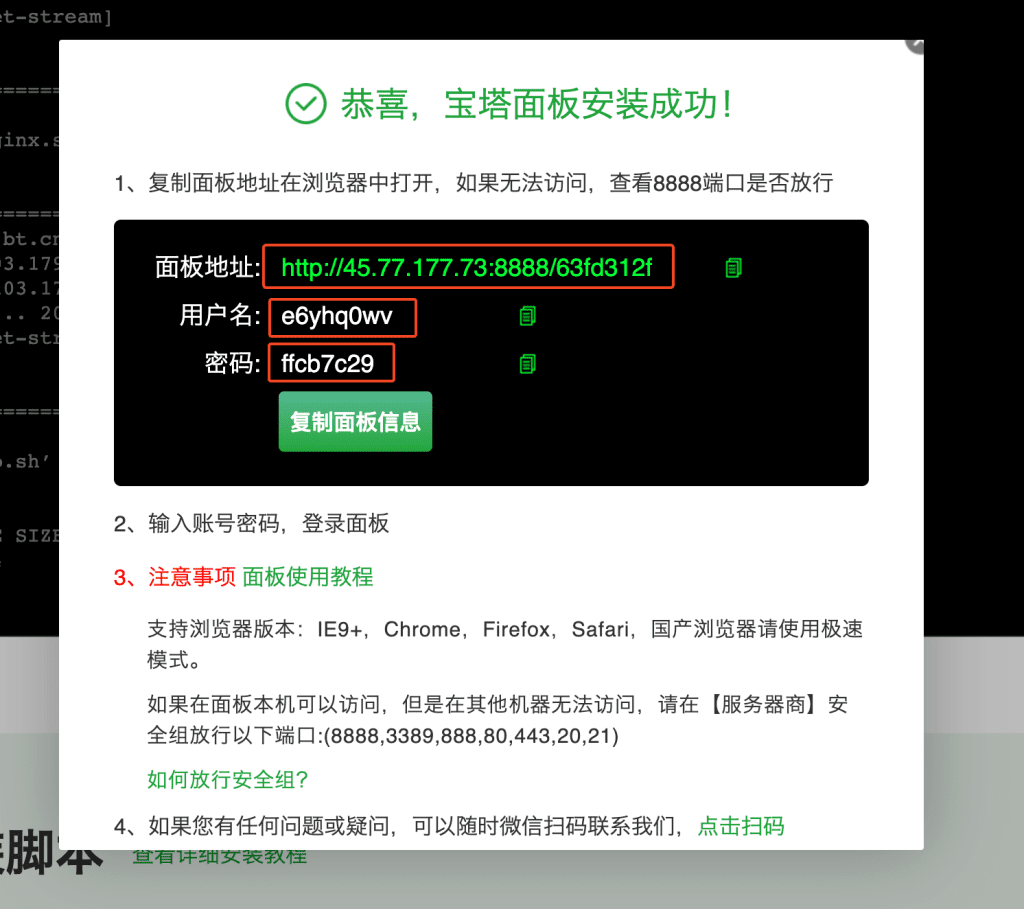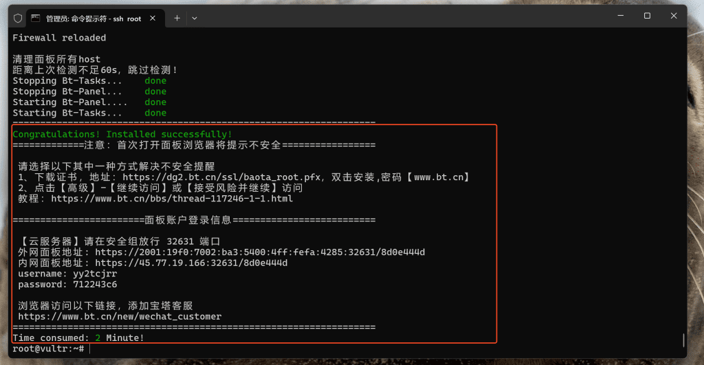 大概5分钟后,会提示宝塔面板安装成功,并提供了登录地址,用户名和密码。然后就可以登录宝塔面板了。