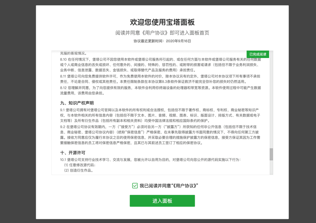 第一次登陆,会提示《用户协议》,勾选“已阅读”,然后点击“进入面板”即可。