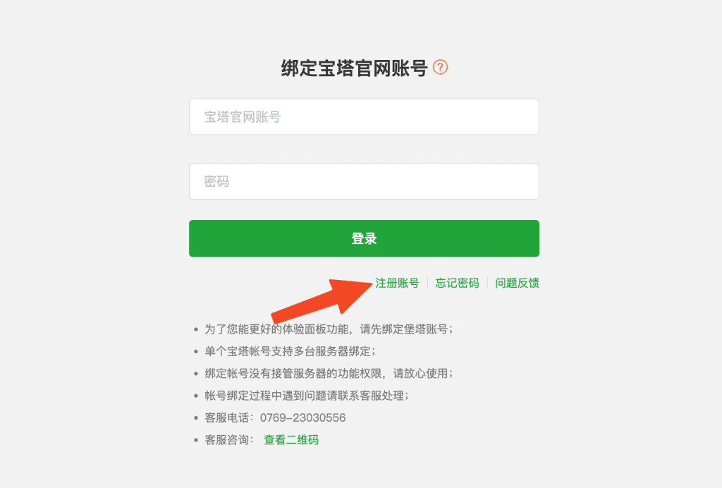 之后会提示绑定宝塔官方账号。如果没有宝塔账号,可以点击“注册账号”,进入账号注册页面。