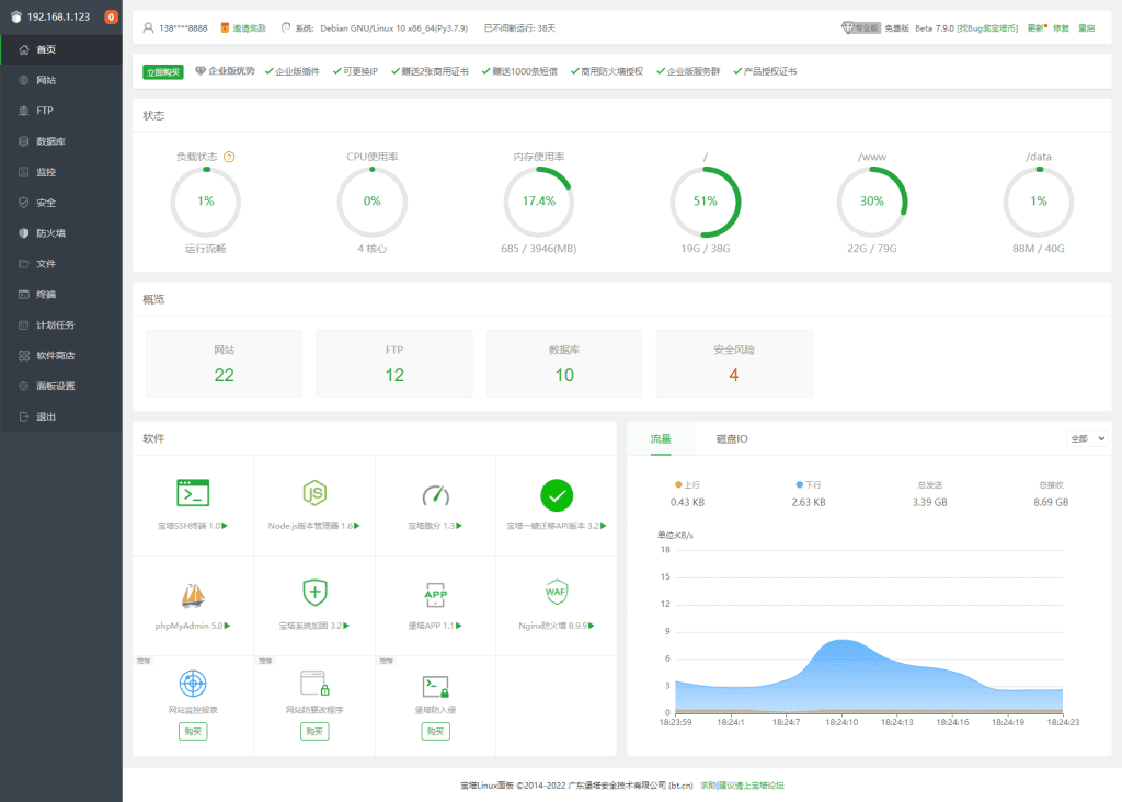 宝塔面板(BT Panel)是国人开发的一款服务器运维面板软件。宝塔面板是开源软件,用户可以免费使用,但是部分高级功能是收费的。