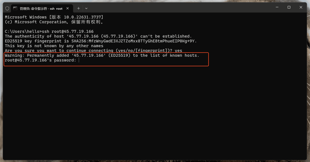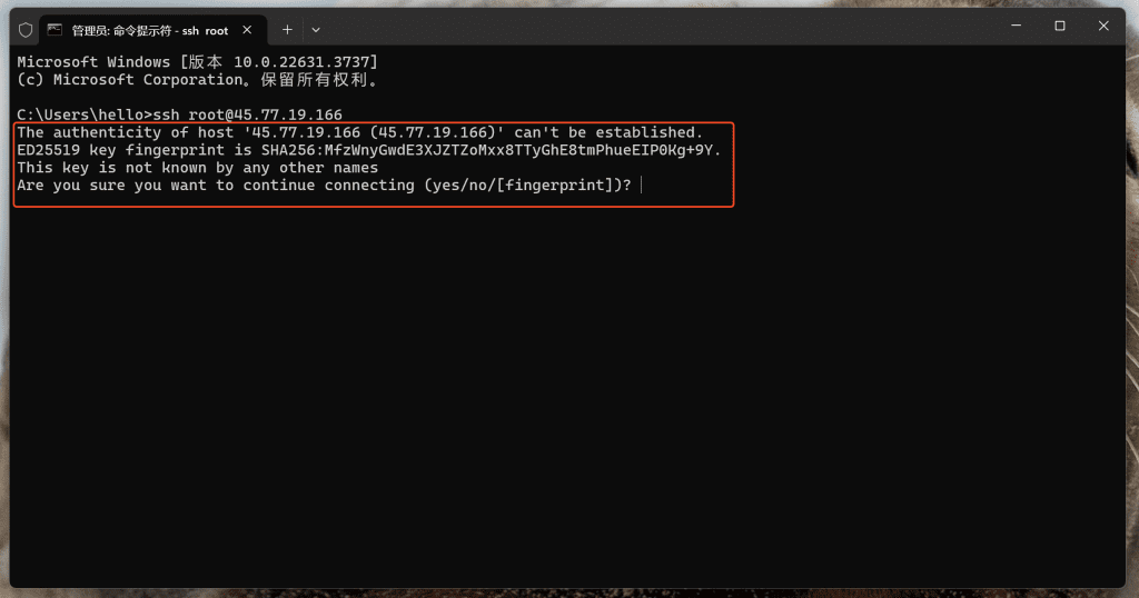 ssh [email protected]然后会显示一串提示信息,在输入”yes”然后按回车键:
