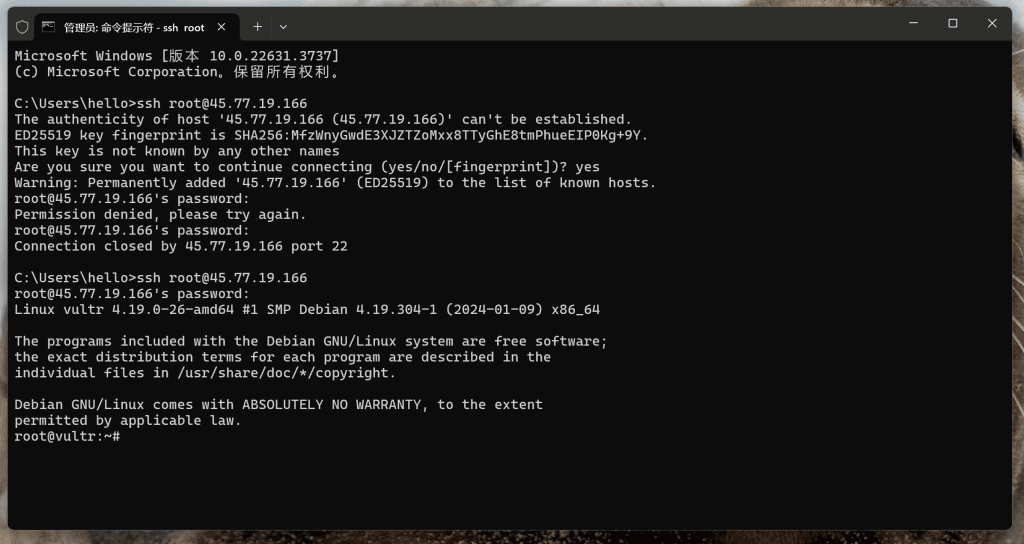 在这个窗口中输入命令,其中@之后的数字,替换成你购买的服务器的IP地址,然后按回车键执行: