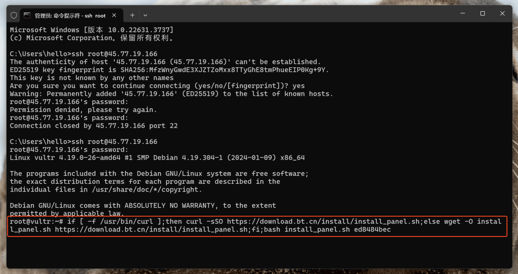 这种方式,需要从自己的电脑上登陆服务器,然后使用宝塔面板提供的脚步命令自动安装。