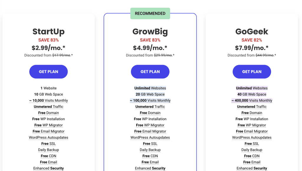 一共有三种套餐:分别是StartUp,GrowBig和GoGeek。三个套餐价格不同,对应不同配置性能和附加功能,适合不同的建站需求。接下来我们详细对比一下SiteGround的套餐配置和价格。