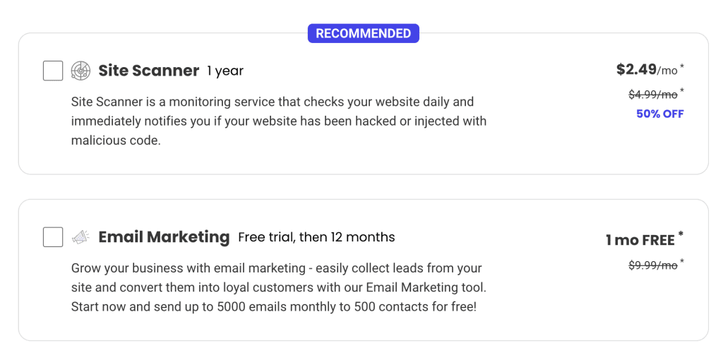 SiteGround在购买时候,可以选购一些附加产品,包括: