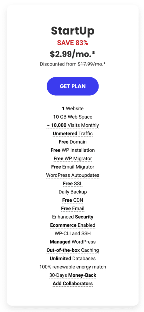 这个套餐提供了10GB的网站文件空间,对于一般的外贸询盘站和跨境电商站,10GB都是足够用的。但是StartUp套餐只能建一个网站,如果想建设不止一个网站,那StartUp套餐就不合适了。