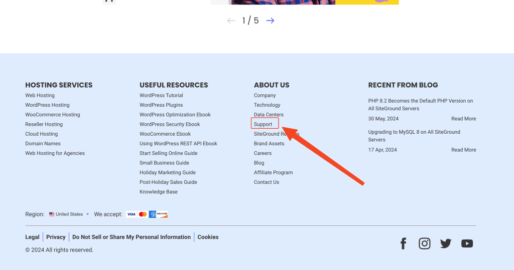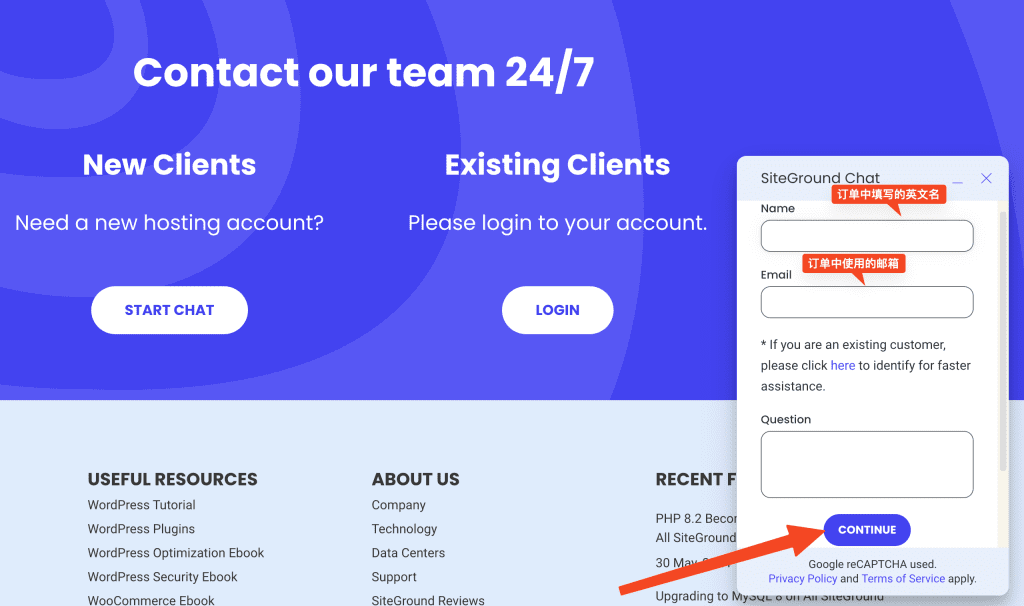 第一步,滚动SiteGround当前页面到最底部,找到“Support”链接,并右键“在新的标签页中打开”。或者在新的标签页直接打开这个链接